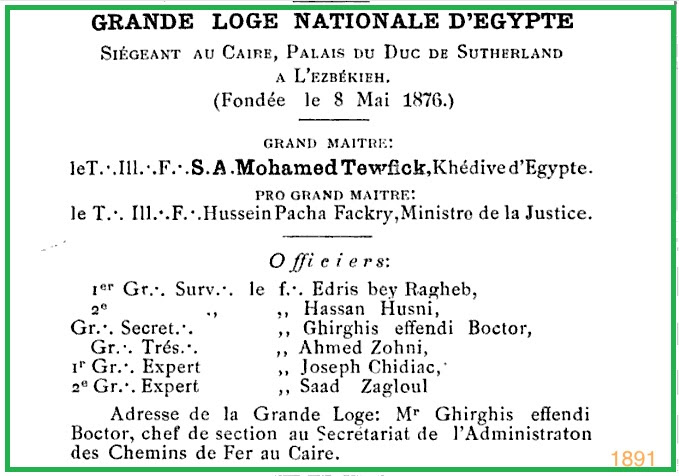 1891 altos miembros Freemason rústico quien además de gobernante de Egipto incluyen entre otros futuro primer ministro nacionalista Saad Zaghloul Pasha